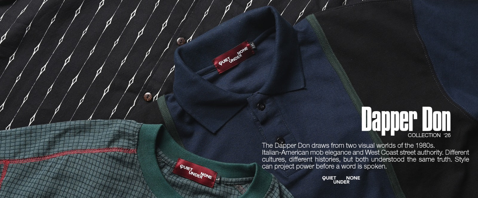 "QUIET UNDER NONE" IS A PLATFORM FOR ARTISTS AND DESIGNERS TO EXPRESS THEIR IDEAS AND CREATIVITY FROM A WIDE RANGE OF PERSPECTIVES AND INFLUENCES. THIS PLATFORM APPEARS TO BE OPEN TO VARIOUS FORMS OF CREATIVE EXPRESSION AND SEEKS INSPIRATION FROM PEOPLE, SPACES, AND EVERYTHING IN BETWEEN. THIS APPROACH SUGGESTS A DIVERSE AND INCLUSIVE ENVIRONMENT WHERE ARTISTS AND DESIGNERS CAN COLLABORATE AND SHARE THEIR UNIQUE VISIONS.